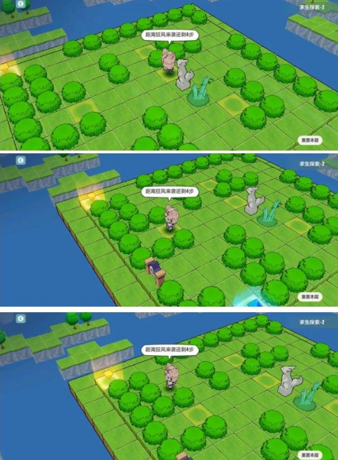 完成条件:解锁所有宝箱,但是每走四步都会将猫吹到树旁边。