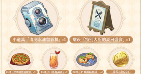 3:然后就是大家很关心的游戏礼包内容是什么,也就是风起之旅礼包,里面有小道具清冽水沫留影机一个,摆设特别大厨的夏日盛宴一个,还有料理肉肉的烤蘑菇披萨两个,料理日落莓莓茶两个,料理奶香菌菇脆塔两个,还有五万的摩拉。