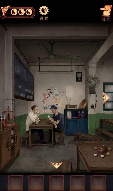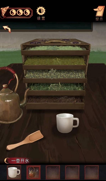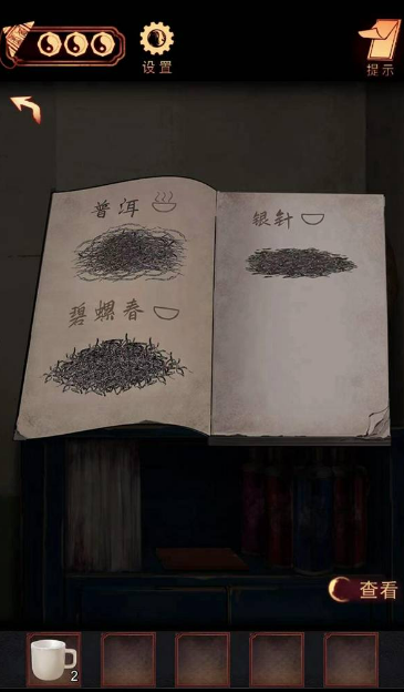 1、点击右侧的茶铺,进店后点击左边柜子上的密码锁,密码提示就在桌上,完成小游戏后可以得到2个【空茶杯】,之后点击两个老人后面的柜子,掀开布后可以考到一本书,翻开后发现这是茶叶的介绍。