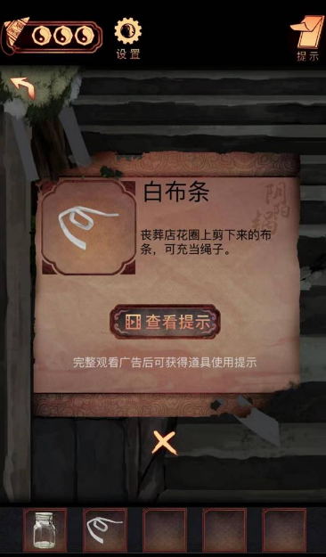 6、回到大街上,点击丧葬店门口的花圈,使用【剪刀】后,得到道具【白布条】。