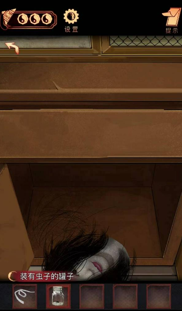 9、点击空座位左侧的下方柜子,打开后使用【玻璃罐】和【镊子】抓住虫,获得【装有虫子的罐子】。
