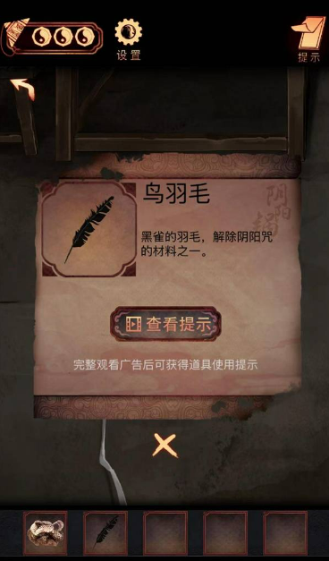 12、回到茶铺,依次将【竹筐】,【树枝】。【白布条】,【装有虫子的罐子】放在地上,之后完成小游戏之后就能获得【鸟羽毛】。