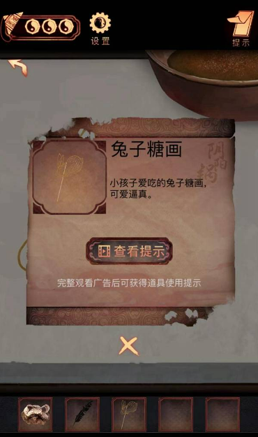 13、点击来到大街上,这时候后丧葬店已经开门了,通过对话得知需要得到糖画才行,再次回到大街上,点击观察制作好的糖画,得到密码是【鸡虎鱼蛇蝶猴】这个顺序,操纵机关后打开抽屉,得到【钥匙】,使用【钥匙】开锁后得到【一锅糖】,之后来到炉子边放上【一锅糖】,获得【一锅糖水】。
