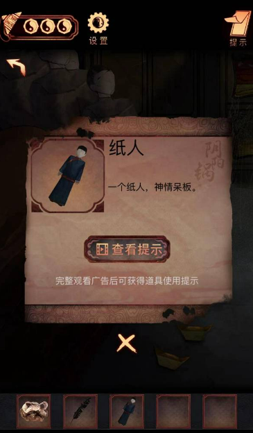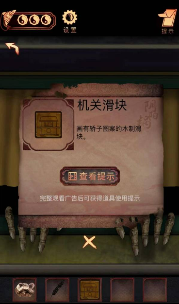 17、将【纸人】放在轿子的左侧,然后点击轿子的窗口,根据左右两边的手指提示,按照【3589】的顺序点击手指,获得道具【机关滑块】。