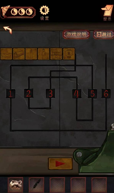 18、将【机关滑块】放到机关上,就可以操作机关了,清点仓库中各种道具的数量,得知轿车1棺材2元宝3腊烛4纸人5灯笼6的数量,这时我们还需要观察机关上排列顺序和数字的对应关系,总结出规律后按照下图顺序放置,得到道具【阴阳玉(阳)】。