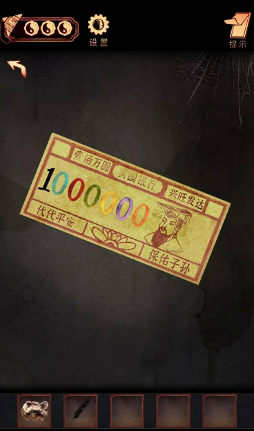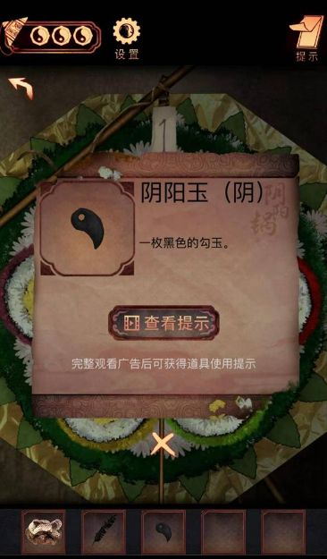 19、点击地上的纸币,上面的颜色排列就是提示,来到丧葬店内,按照纸币上的顺序提示,调整花圈上的颜色位置,打开机关后得到道具【阴阳玉(阴)】