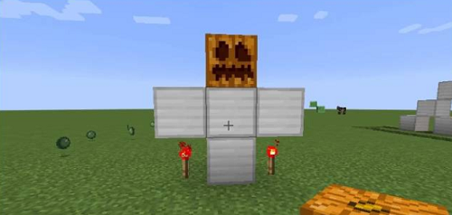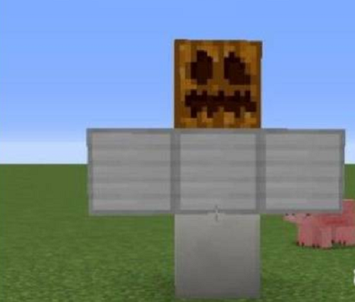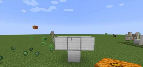 2、把南瓜放再最中间的那个铁块上,两边的铁块下面必须要是空的,否则不能做成铁傀儡,比如下图。