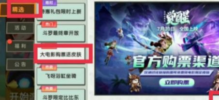进入游戏首页,点击精选,在精选中找到大电影购票送皮肤的按钮,购买迷你世界之觉醒的电影票。