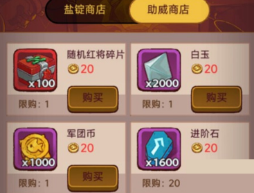 助威币多,商品兑换优先度:随机红将碎片>白玉>军团币。