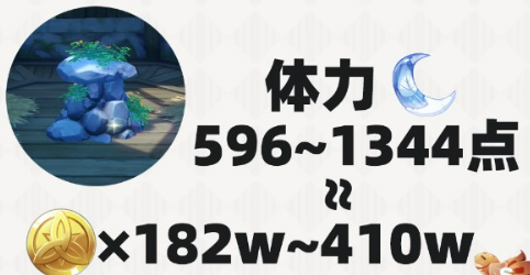 9.最多=所有水泡里都有石堆=205个石堆×每个石堆2w摩拉=410w摩拉=(410/6.1)×20≈1344点体力(按照60满级来算)≈自然回复7天的体力。