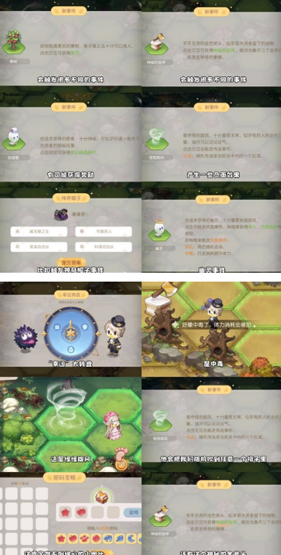 果树、神秘的金斧头、创造使、怪怪旋风、幽灵、神奇帽子(答题)、幸运转盘,不同时间产生不同效应!有好有坏!