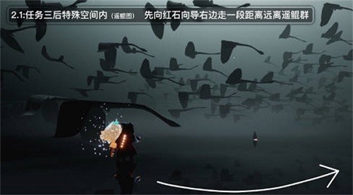 2:然后任务三之后的特殊空间中,我们先向着红石想到右边走一段距离,远离遥鲲群,如图所示