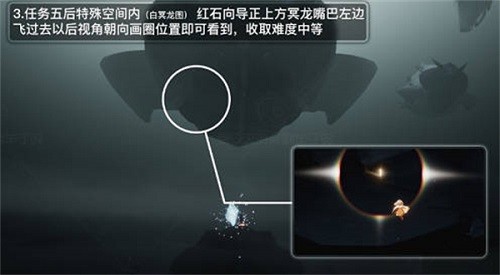 4:最后就是任务五的特殊空间中了,我们在任务五的特殊空间中红石向导正上方冥龙嘴巴左边飞过去之后朝着视角方向画圈的位置就可以看到了,如图所示