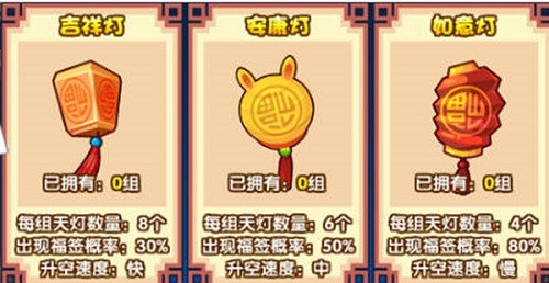 3:同时我们在游戏中有三个灯,吉祥灯,安康灯,如意灯,这三个灯出现福签的概率和升空的速度是不一样的