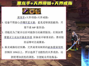 1、黑龙手镯+天界项链+天界戒指。这套融合史诗装备,不用担心手镯压蓝太厉害,足够放技能,但前提是非MP流派。