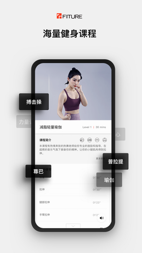 FITURE提供了丰富的海量课程内容,从基础的有氧运动到力量训练、瑜伽、杠铃,普拉提,拳击、HIIT、舞蹈等,您可根据自己的喜好及运动水平选择适合的课程,FITURE相关课程均由行业内顶级的明星私教拍摄录制而成,让你足不出户就能享受到精品健身房的运动体验。
