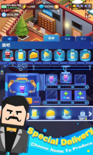 2.挂机升级要海量的财富,各种道具能使用起来,加快酒店的发展,提高员工的能力