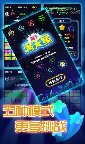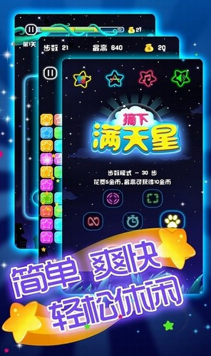 闪闪满天星是一款休闲消除类闯关游戏应用,闪闪满天星手游拥有五种挑战模式,玩家将自由玩转消除任务精彩,海量的游戏关卡等你来挑战,没有任何的门槛,只需要几个简单的步骤就能轻松体验赚钱小游戏的乐趣,关卡越多奖励越好,丰富的关卡不仅有多种模式更有华丽的特效以及各种不同的道具等你来体验,游戏上手容易随时随地都可以轻松加入适合打发无聊的时间。喜欢的玩家赶紧来下载吧!
