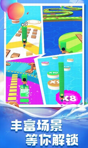 3、游戏里有众多丰富的关卡场景等你来解锁,体验水上乐园,激流勇进的大作战比赛。