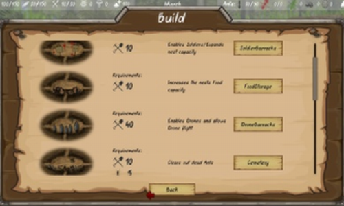 一开始蚁群只有几个工蚁和王后。你的目标是发展足够大的蚂蚁窝!最后的蚂蚁汉化版是一款回合制地牢建设游戏,你是游戏内蚂蚁军团的总指挥!一开始蚁群只有几个工蚁和王后。你的目标是发展足够大的蚂蚁窝!设计建设游戏随机生成的世界,每一次都有不同的挑战,就像大自然当中真实的蚁群一样,作为他们的“蚁后”你需要指挥这些工蚁们进行建设,从零开始慢慢的建设属于你自己的蚁巢,感兴趣话就开来下载这款最后的蚂蚁!