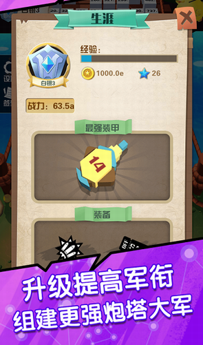 3、升级提高军衔,组建更强炮塔大军。
