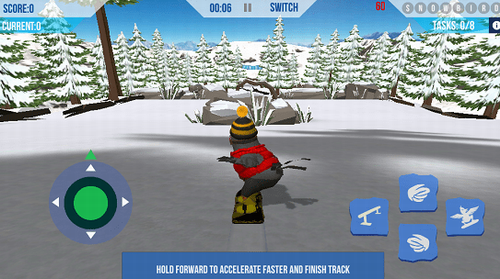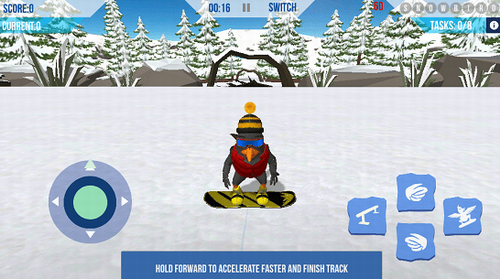 2、游戏中玩家需要通过虚拟按键来帮助雪鸟完成它的滑雪冒险任务。