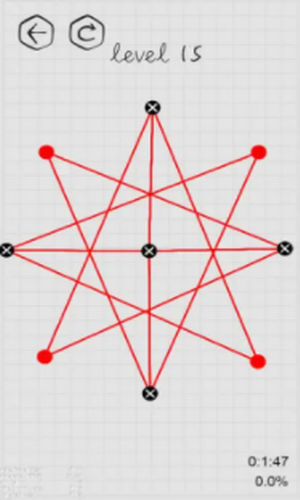 游戏中至少有两个点,每个点与其余至少两点以直线相连,玩家需利用推理力,创造力,空间力来移动节点,使所有连线均不相交!