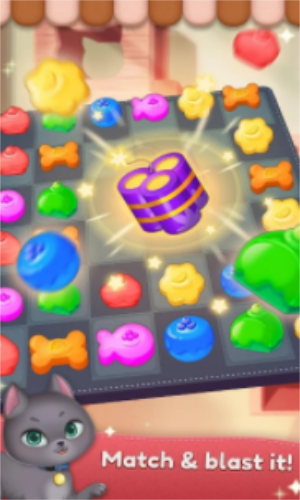 2.完成的剧情冒险,挑战三消游戏关卡,获得惊喜盒子,收集宠物猫喜欢吃的食物