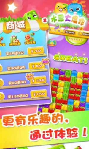 1.精美的画面,一次消除不同数量的水果,会获得不同效果的道具水果