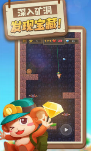时刻都可以进行挑战,确保自己早日实现初始梦想。猴猴矿工破解版是一款非常好玩的休闲益智类型的游戏,玩家需要在游戏当中不断的进行闯关,不断的挖矿,玩家需要通过获得足够分量的矿石来达成关卡的要求,顺利的通过关卡,游戏的操作非常的简单,迎合了更多玩家喜好,快速的完成目标任务,能够获得的奖励会极多,再就是萌系卡通的画风,整个的视觉观感都让人沉浸不已!
