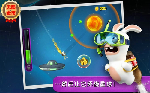 1、用球棒把疯狂兔子送入太空,利用喷气背包和星球重力来控制它的行动轨迹。
