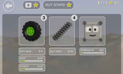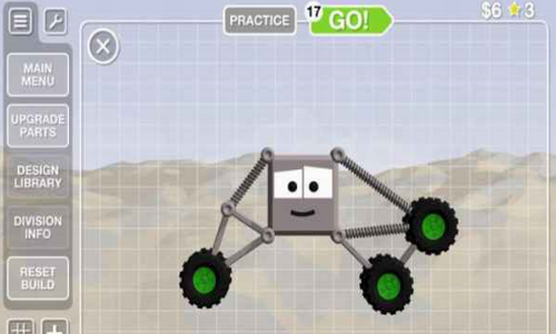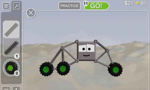 总算是找到这样的游戏了,这款通过自己改装制造车辆来挑战崎岖的山路,游戏开始,会有一个简易的车型,由几个**子、弹簧、铁棍组成的车辆,由玩家改装一下,可以更快的通关需要挑战的赛道