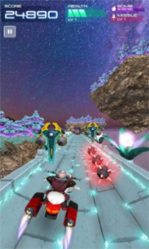 2.驾驶你的太空摩托能飞行穿梭在场景中之中,躲避前方所有的危险障碍勇敢的前进