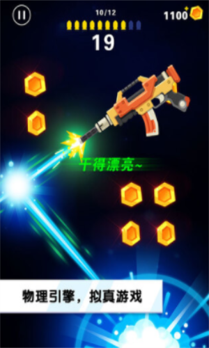 翻转射击无限金币版是一款休闲娱乐物理学射击类游戏。玩家需要使用有线的子弹,利用子弹的后坐力让枪械不断的网上飞升,利用这个后坐力找准角度拾取途中的金币和弹夹,弹夹可以填充你的子弹让你生存得更久。每一个枪的枪击实际效果和炮弹总数全是不一样的,游戏玩家必须尽量多吃取点卷和炮弹,才能得到更好的成绩。还有超多酷炫个性皮肤等你来解锁。有需要的朋友们赶紧来下载吧。