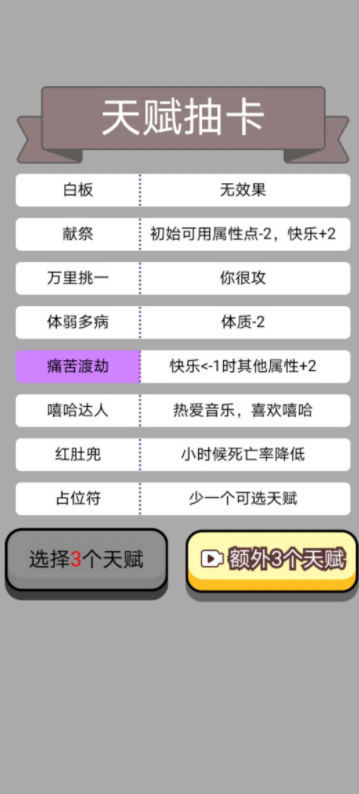《人生幸运岛重开模拟器》是一款十分类似于人生重开模拟器的游戏。经典游戏玩法,让你多次体验人生,游戏的界面十分的简练,全新的不一样的天赋为你带来不一样的玩法。开局就送十连抽,让你取得无与伦比的游戏体验。感兴趣的小伙伴快来下载体验吧!
