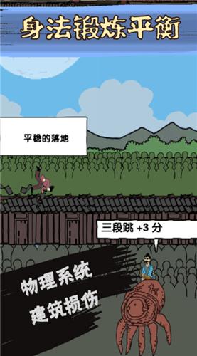 基础玩法为三段跳, 加入动作难度计分点, 1,2,3段跳成功落地各+1,2,3分, 失败被嘲讽,这个难度小意思。