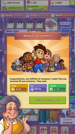 玩家可以出售上百种不同的物品,不断地扩建,提升商店的规模和吸引力,在放置店主游戏里享受不同人生。