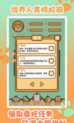 可以在这里不断的开启属于你自己的冒险。饲养人类模拟器破解版这是一款让玩家通过成为喵星人反向饲养人类的预习。你将在游戏中以一只大橘猫的形象喂养人类。你需要用不同的方式让你的人类快乐,通过完成不同的委托任务获得不同的奖励,当你的人类各项技能都得到提升后,作为主人,你需要解决人类的各种麻烦,期间会发生很多有趣的事件。你需要完成不同的委托任务来获得奖励,还需要利用不同的方式来逗人类开心。除此之外,你还可以搭配不同的装饰,来打造属于自己的角色!