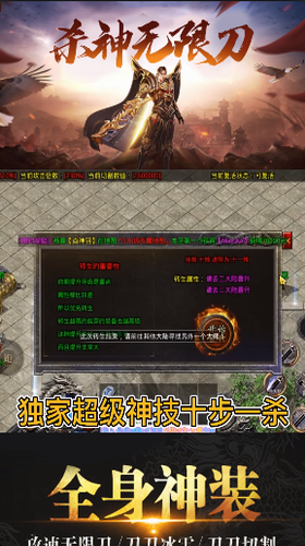 杀神无限刀传奇官网版是一款全新推出的传奇游戏,上线就送礼包,无限制战斗,积累的战斗,热血的游戏战斗,完美的游戏复刻玩法,驰骋你的沙场,谱写你的传奇之旅,游戏质量非常的不错,玩家在游戏中可以自由的冒险,海量的游戏福利,玩家只要上线就能领取,刀刀暴击,轻松就能击杀BOSS,还有很多的玩法,感兴趣的朋友快来下载体验吧。