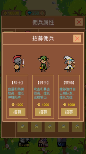 挂机佣兵团破解版是一款复古像素玩法的挂机冒险游戏,虽然只有三种职业的佣兵,但是各自的技能不同,所以能够创造出各种阵容,游戏中玩家能体验到非常不错的挂机休息冒险世界的完美乐趣,多种不同的趣味游戏内容,好玩的休闲游戏玩法,给你带来最棒的神奇游戏体验,游戏美观华丽的视觉效果,让很多玩家都沉迷其中,感兴趣的朋友快来下载体验吧。