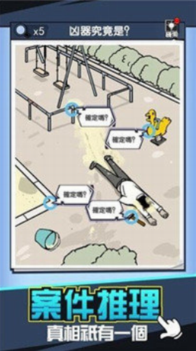 你要通过找线索和对嫌疑人提问,从中找到破绽判定谁才是真凶,