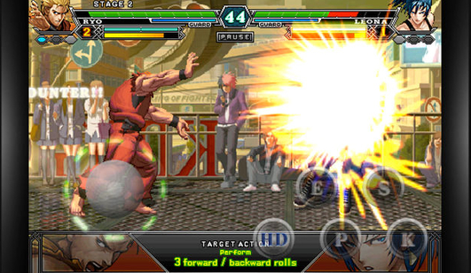 拳皇2012破解版中文版下载除了所有的角色都有专属的技能以外,还有独特的技能和攻击方式,手机版本简化了大招的出招方法,只要你满足条件,就可以点击血条来直接使用,但是人物普通必杀还是要搓招的,有一点类似于风云再起的感觉。