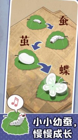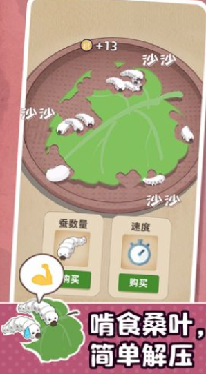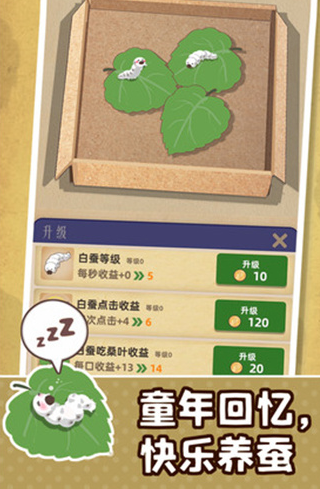 1、轻松治愈系的游戏主题,简单放置趣味养蚕。