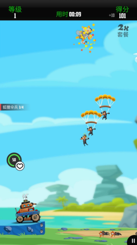 众多让人眼花缭乱的狐狸伞兵从天而降,玩家需要利用超快的反应能力使用武器击灭狐狸伞兵。