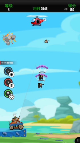 玩家们需要不停的不同角度的射击狐狸的伞兵,组织它们顺利的着陆,只要轻触屏幕就能射击了,操作还是很简单的,但是有时候会不停的冒出狐狸伞兵们来,这个时候就应接不暇了,去商店中够买更多更强力的武器来对付这些狐狸们,让你的坦克威力升级是必要的,游戏可以进行各种成就任务挑战,完成就可获得一定成就,用这些激昂历来升级的坦克战车或者购买辅助道具,你要存活下去。
