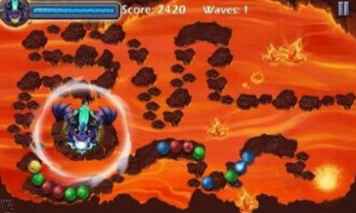 在游戏中你的目的是消除屏幕上沿着轨道前进的所有球,但要赶在球进入场景中的神秘黑洞之前,控制你的龙对准轨道来发射球,三个或以上的同色球接触在一起就会消去。