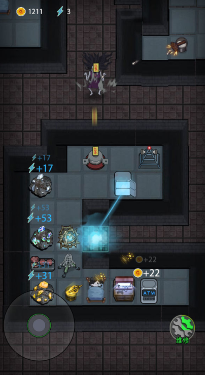 然后发育时候一般也是先造门床,炮塔造不造的很随意,造了也打不死鬼,很多时候打着打着鬼升级了,感觉根本不掉血了。