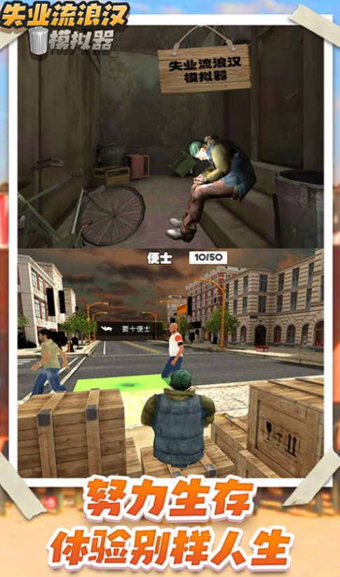 《乞丐模拟器 Tramp Simulator: Survival City》在城市街道上与其他流浪汉竞争生活,寻找食物和金钱,建造庇护所,制造武器和工具,玩这个无家可归者生存模拟器。这不像是一个幸存者在一个失落的热带岛屿上度过的时光——如画的海洋,多汁的水果和宜人的天气,今天,你的目标是在混凝土丛林中生存!你的对手不是野蛮的掠食者、热带雨天或你可能在生存岛上度过的其他危险-与警察战斗或躲避他们以避免逮捕、抢劫和钢铁,为自己提供食物,挖掘垃圾以找到武器或有用的生存工具!流浪汉模拟器:生存之城-这是一个伟大的无家可归者生存模拟器,适合那些准备冒极大风险的人!抢劫、盗窃、狩猎、打架和探险!