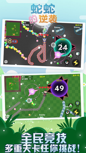 蛇蛇的逆袭安卓版是一款趣味休闲的贪吃蛇玩法的吞噬游戏,在这款游戏中玩家可以体验到很多有趣的贪吃蛇游戏玩法哦,这款游戏的玩法类似于贪吃蛇大作战,游戏里玩家考可以与其他玩家在线pk,游戏画面明亮,蛇蛇灵活的动作非常带感,游戏中多种多样的玩法模式等你来挑战,炫酷的皮肤,轻松娱乐的游戏玩法,十分耐玩,感兴趣的朋友快来下载体验吧。