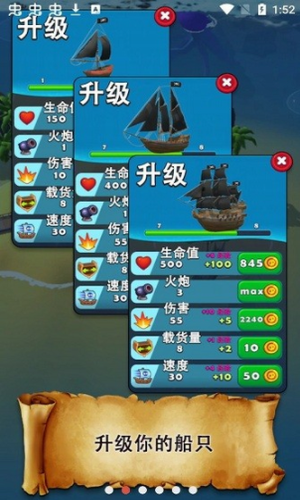 3.超自由的养成玩法让你能够自由养成你喜欢的海盗,合理搭配出战阵容来秒杀你的对手。